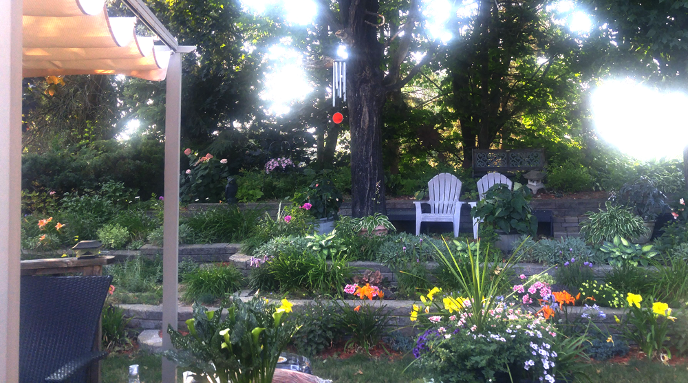 Scott and Sandy moved into their pie-shaped, sloped property 30 years ago. The trees on their own and adjacent properties provide excellent shade throughout the day. Two large, mulched flower beds in the front feature an assortment of daylilies, coral bells, peonies, grasses, irises, hostas and evergreen shrubs. On one side of the house is a patio and deck built by Scott. Here, he has many containers of plants including calla lilies, canna lilies and agapanthus that he overwinters inside. The backyard space is gently sloped and leads to a line of trees, creating a beautiful setting for their plants. When they first moved in, Scott built a series of low retaining walls to create terraces filled with plants and bulbs. In the spring, approximately 2000 bulbs (including some purchased at past gardenKitchener bulb sales!) put on a magnificent show. The late spring and summer flowering season continues with irises, daylilies, liatris, sweet Williams, coreopsis, sedums and hostas. To keep track of all of his plants and bulbs, Scott has them inventoried on Excel. This allows him to know what is already in the gardens and where there is room for a new plant. (Spoiler: there’s always room!) Scott and Sandy also decorate their wooden fence, as well as the side and back brick walls of the house, with a variety of artwork, creating an eye-catching experience wherever you look.
